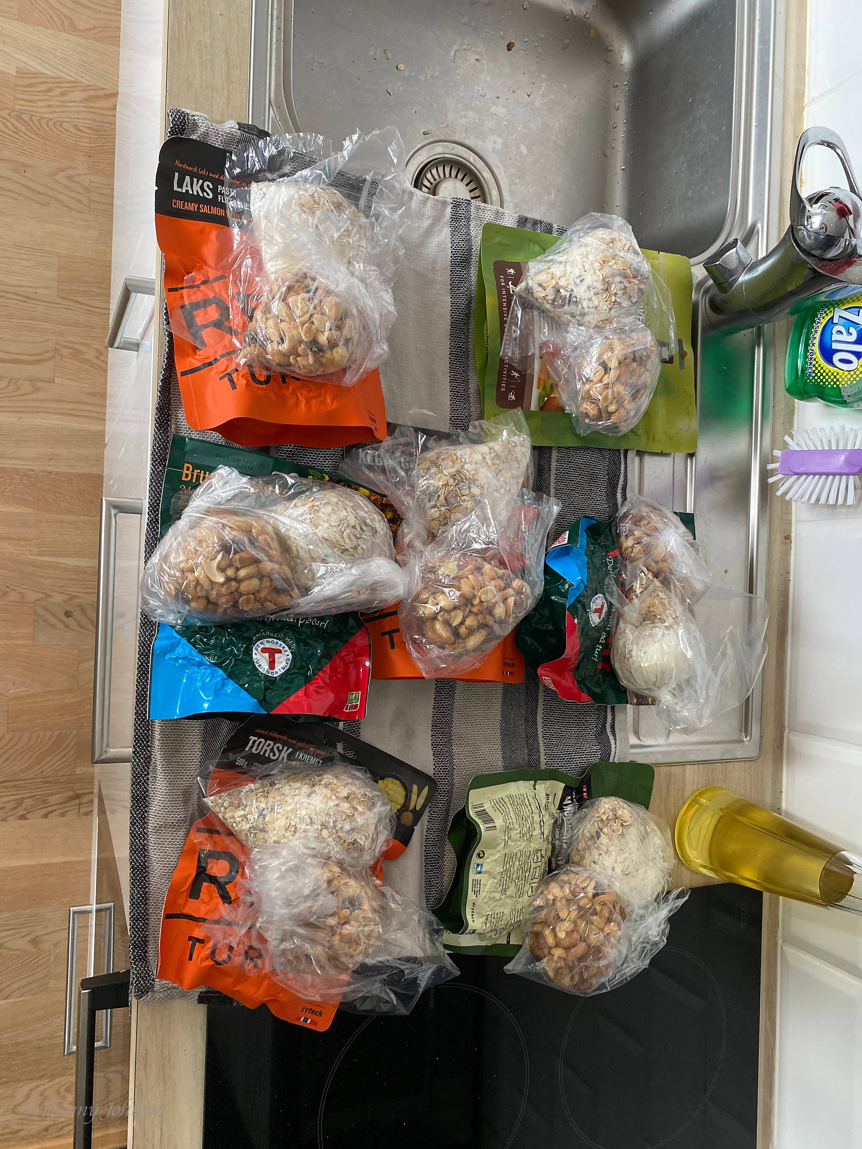 Maten på kjøkken håndkle er også min mat for 5 dager, jeg også hadde med litt ekstra energi bar og energi drikk pulver som ikke er med på bildet her.