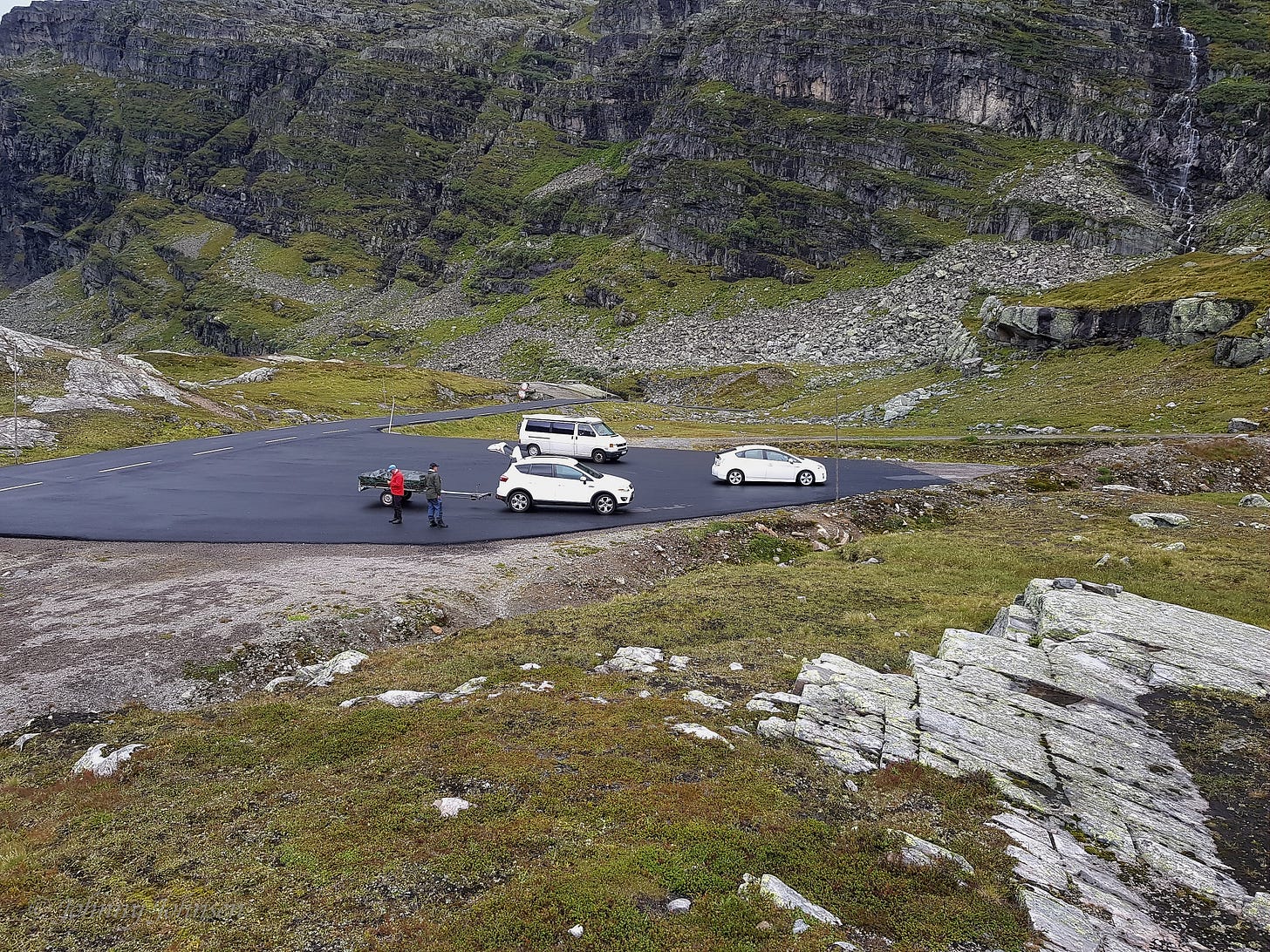 Det er forstålig siden det ene stoppet var på bensinstasjonen i Eidfjord der jeg skar rett inn på en ledig parkering men hadde i farten glemt at jeg hadde 5 meter med tilhenger bak bilen.