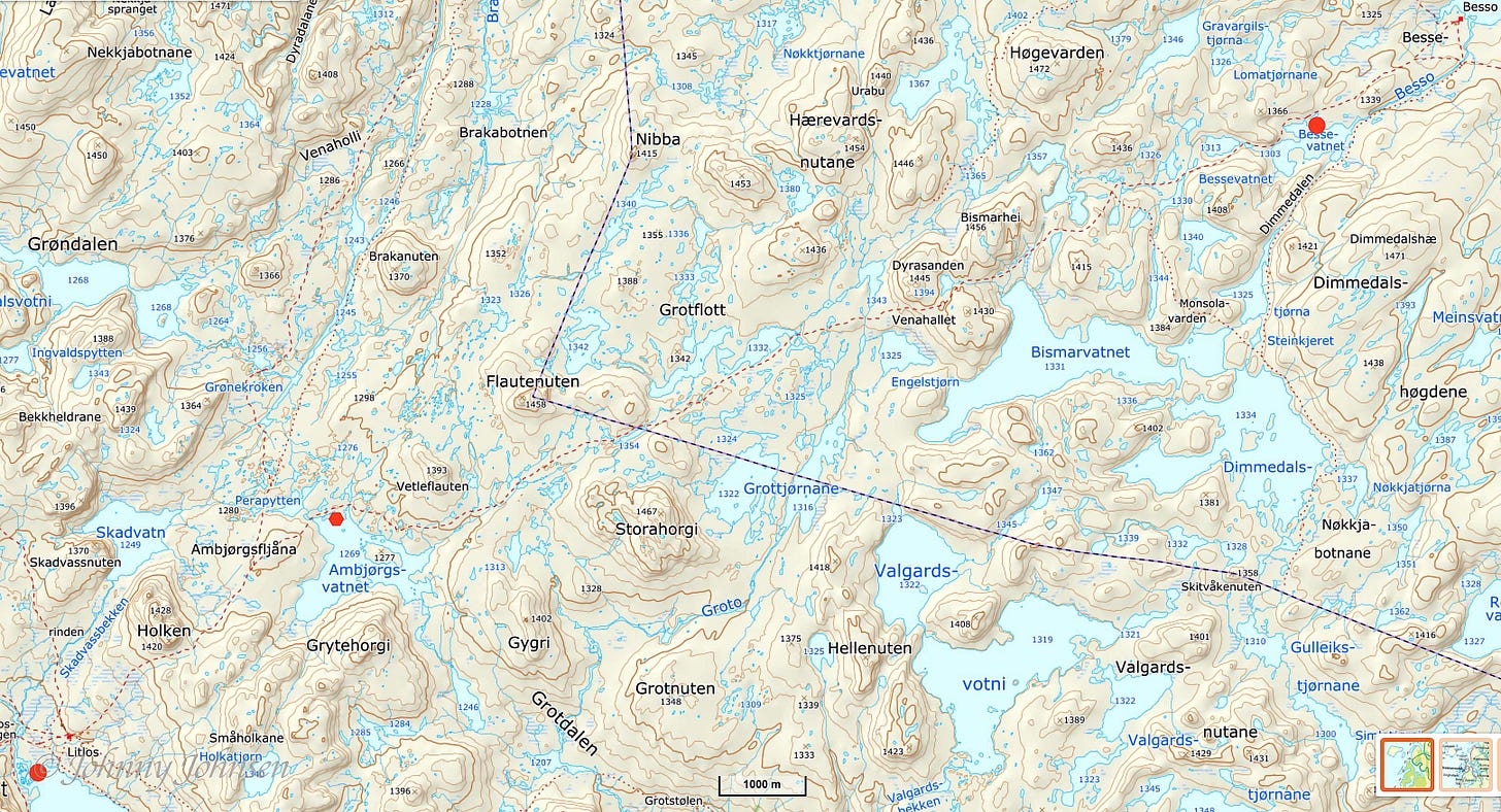 På kart over så har jeg merket av starten vår ved Bessevatnet, leiren ved Ambjørgsvatnet og leiren til Asbjørn og Trond ved Litlosvatnet.