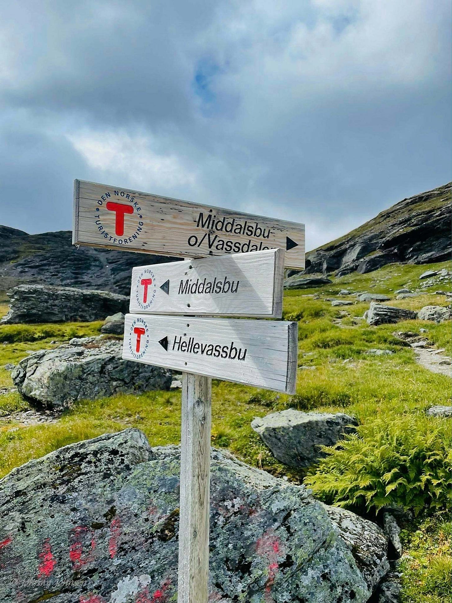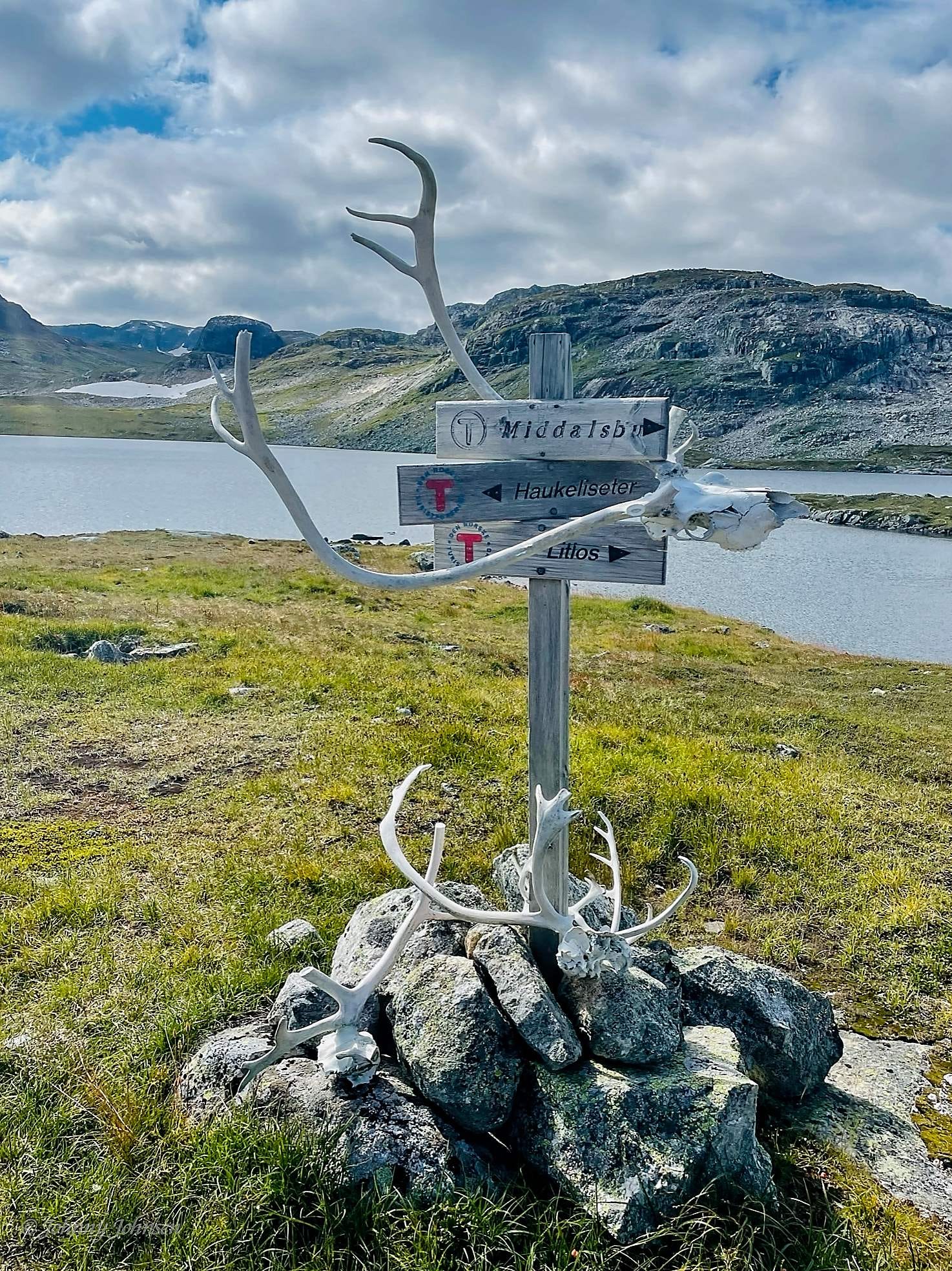 Så etter å ha rotet litt og bommet på “avkjøringen” så ruslet vi ned mot Haukeliseter og fulgte nøye med for å få med oss skiltingen til Middalsbu. Etter langt om lenge så kom stien som vi hadde håpet å se, så da bar det ned mot E134. Denne stien er nok ikke mye brukt, og var ganske utydelig innimellom.