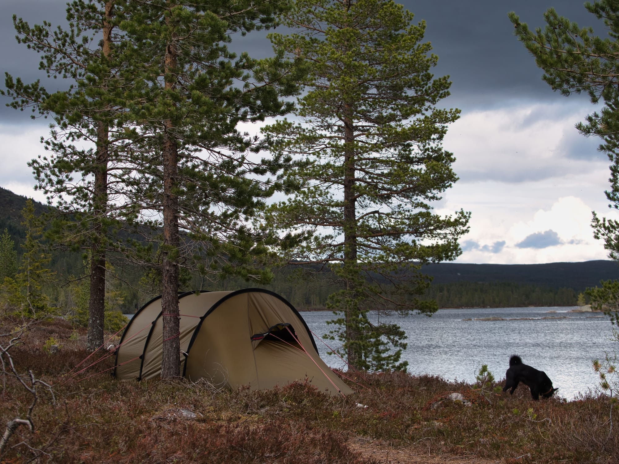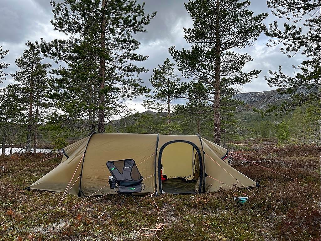 Regnbygene skulle slutte i 14 tiden her opp, før det så skulle begynne å regne kraftig igjen i 20 tiden på kvelden, da skulle det regne i ett i 12 timer. Dette skulle vise seg å ikke stemme helt, og jeg er kjempe glad for at vi hadde oppholdsvær fra vi gikk fra bilen og frem til til teltet vårt var oppe. Jeg hadde ikke mer enn fått alt på plass inne i teltet før himmelen åpnet seg.