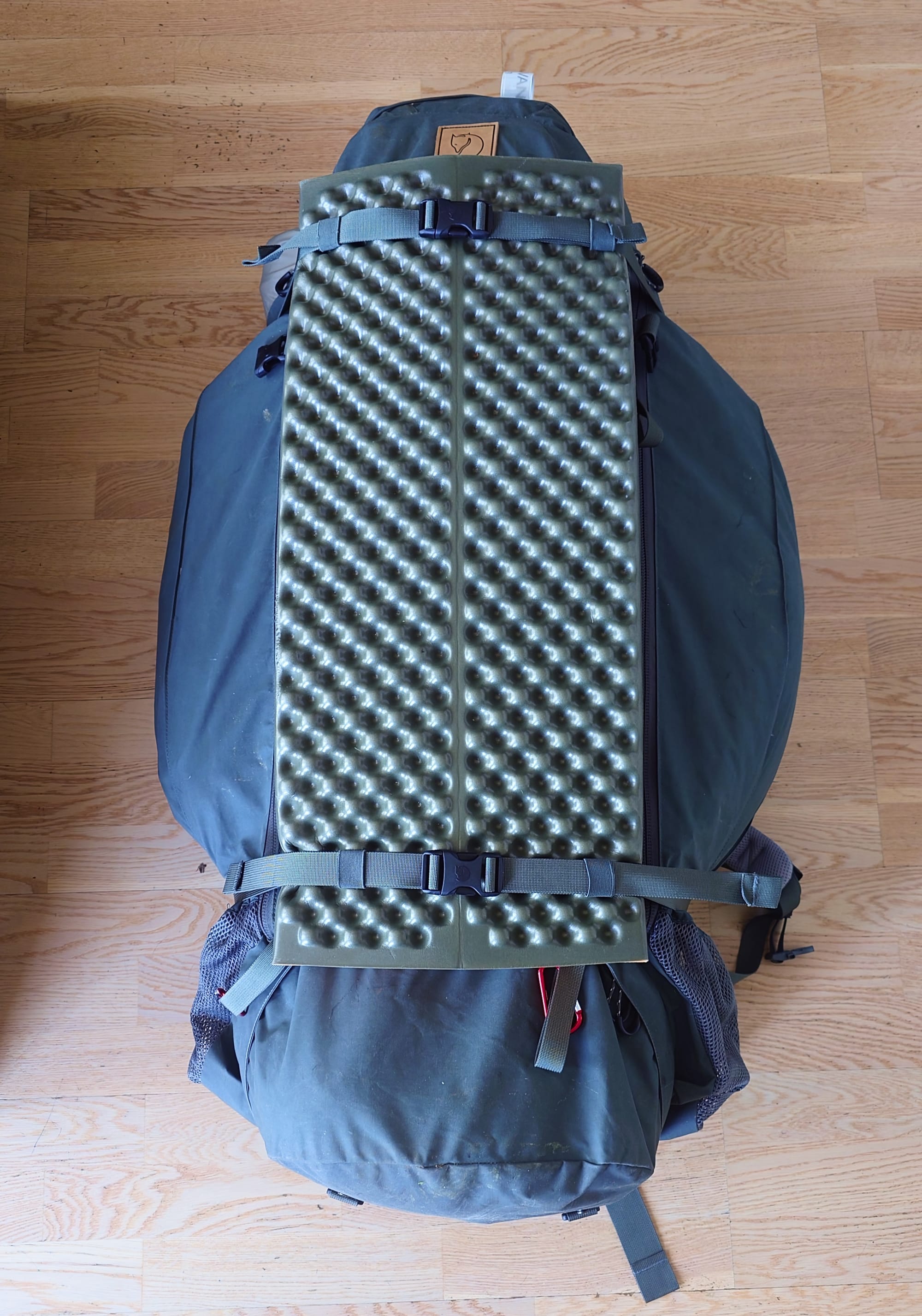 Jeg har nå et “trekkspill” liggeunderlag med eggekartong struktur, dette henger alltid på utsiden av sekken og brukes på samme måte som jeg gjorde med det gamle Bamse underlaget når jeg er på teltturer. Denne løsningen har jeg valgt for kunne hatt et underlag til å ligge på på utsiden av teltet uten å være redd for at det går hull på det, og for å øke R-verdi og ligge komfort i teltet. Pluss at det oppblåsbare liggeunderlaget fra Exped da får en ekstra beskyttelse mot punktering.