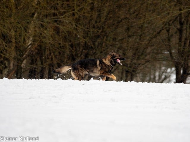 Jeg reiser meg opp, går bort fra hunden og skal kose litt med Kenny før jeg ringer til politiet, den godeste King Kenny følte seg nok litt tilsidesatt i denne situasjonen. Mens jeg gjør dette så kommer Schæferen bort til meg og setter seg bak ryggen min, helt fantastisk. Etter at jeg har sittet å klappet en hund med hver hånd en stund så hilser Schæferen på Kenny, og den er blitt litt roligere enn den var. Så da benytter jeg sjansen å ringer til politiet. De opplyser at de egentlig ikke er så interesserte i å hjelpe, og at det eventuelt vil bli veldig dyrt for eieren av hunden, de råder meg til å “prøve å finne på noe” og heller ringe senere om det ikke skulle gå greit!