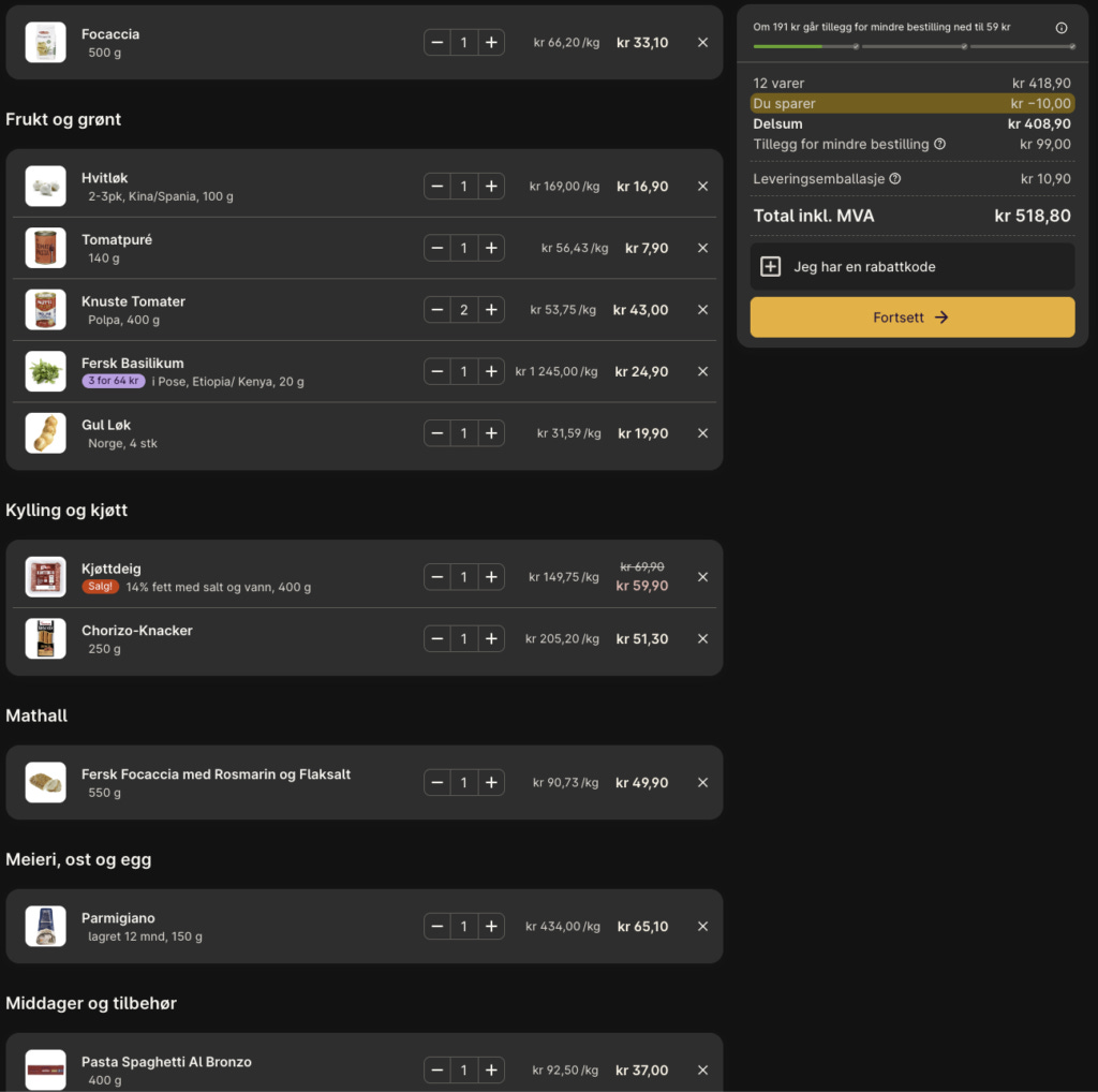 Jeg har nå lagt alle ingrediensene jeg ikke har i skapet fra før i handlekurven min på Oda der jeg handler 4-5 ganger i året. Jeg har lagt til både melblanding til å lage Focaccia og et ferdig bakt et. Som regel baker jeg dette selv, men jeg må nesten se hvordan neste uke utvikler seg. Blir det dårlig med tid så lar jeg det ferdig bakte ligge i kurven. De er gode de også, men de blir veldig fort veldig tørre.