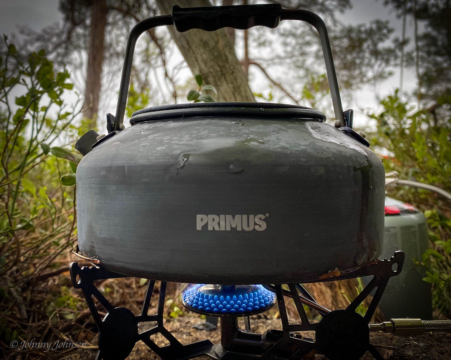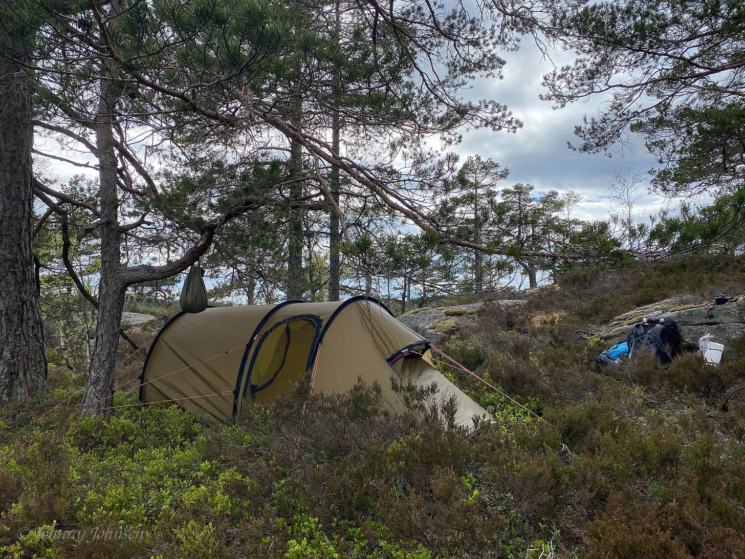 Teltet hadde jeg satt opp under et solid tre med en tarp over inngangen slik at jeg kunne sitte i åpningen og kikke utover på lesiden av vinden om vindretning ble slik værmeldingen hadde meldt. Hovedgrunnen til at jeg brukte tarp på denne turen er at når det regner og inngangen på teltet er åpen, så renner vannet rett inn i forteltet, dette er en av de få bakdelene med mitt Hilleberg telt.